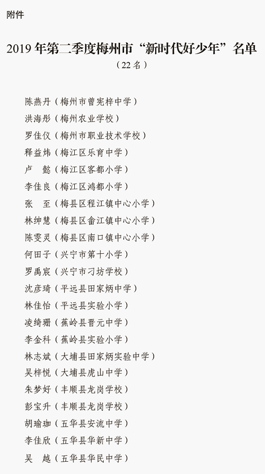 为深入贯彻习近平新时代中国特色社会主义思想和党的十九大精神,努力培养担当民族复兴大任的时代新人,培育和践行社会主义核心价值观,帮助未成年人“扣好人生第一粒扣子”,培育中国特色社会主义事业建设者和接班人,落实立德树人的根本任务,充分发挥我市未成年人先进典型的引领示范作用,激励更多的未成年人自觉践行道德规范,增强道德意识,养成良好品格,市文明办、市教育局、团市委、市妇联、市关工委等部门联合在广大未成年人中开展了“新时代好少年”推荐评选和学习宣传活动。活动开展以来,全市各中小学校踊跃推荐,各部门严格把关,在广大未成年人中涌现出许多文明友善、自强自立、孝老爱亲、勤劳节俭、乐于助人的楷模。经宣传发动、推荐申报、组委会评定等程序,决定授予陈燕丹等22名同学2019年第二季度梅州市“新时代好少年”荣誉称号。