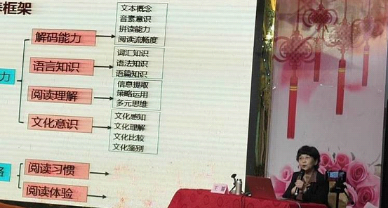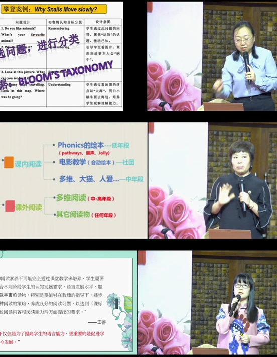 开幕式结束后,王蔷教授就《基于核心素养的英语绘本阅读教学——理念、意义、原则与途径》作了一场全面而有深度的讲座。王教授在讲座中提到教育要回归原点,关注人的发展;教学要走向服务学生学科核心素养的发展,以主题意义为引领,以语篇为依托,整合学习语言知识与文化知识,运用听、说、读、看、写等方式,理解和表达意义、意图和情感态度,发展逻辑思维、批判思维和创新思维,推动深度学习;研读文本、重视情境、梳理主线、构建结构化知识、关注内化提升、迁移创新,是实现培养学生学科核心素养的重要条件。她谈到成功的阅读教学取决于教师的文本解读水平和有效的学生学习活动设计。最后,王教授以故事类文本“聪明的毛毛虫”为例,解释如何进行文本解读,并深刻阐释阅读教学设计基本教学流程。