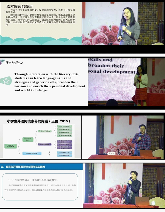3月29日上午,研讨活动围绕小学英语拓展阅读适切教研实践的现状、困惑和需求展开,内容紧凑而丰富。汕头市教育局教研室英语教研员张秋红以小学生阅读心理与需求为出发点作了题为《越读越快乐——汕头市开展小学英语阅读教研交流》的经验交流,茂名市教育局教研室副主任、英语教研员詹晴儿发言主题是《小学英语拓展阅读教学探索与研究》,韶关市教育科学研究院小学教研室主任、小学英语教研员吴秉健作了“大声思考”和技术支持阅读交流创造性表达的《小学英语绘本阅读教学交流分享》,丰顺县教育局教研室小学英语教研员陈燕芬老师作了《丰顺县小学英语阅读教学概况》的主旨发言。