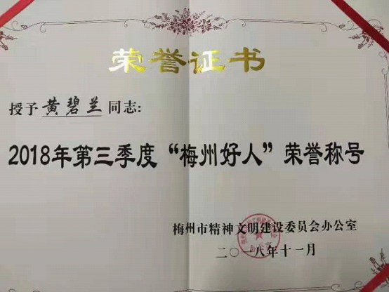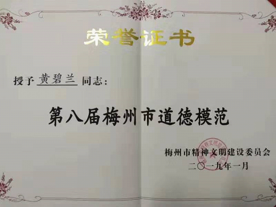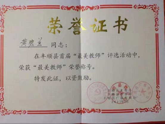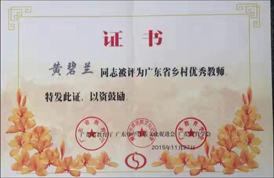 黄碧兰老师是千顷学校小学部数学老师。她从教二十多年来,扎根山区,尽心尽责教书育人,在平凡的工作岗位上,曾获得多项荣誉:2015年11月被广东省教育厅、广东中华民族文化促进会、广东省学会评为广东省乡村优秀教师;2016年被广东省雁洋公益基金、梅州市教育局授予叶剑英基金优秀教师荣誉称号;2017年获得丰顺县首届最美教师荣誉称号;2018年1月获得2017年马云乡村教师奖;获得2018年第三季度梅州好人荣誉称号;2019年获得第八届梅州市敬业奉献模范等荣誉。