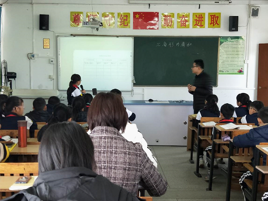 接着,吴鸿彬老师带来的四年级《三角形内角和》课堂展示。吴老师先和同学们一起复习旧知,从而引出内角的概念。为了更好地探索三角形内角和的神秘世界,吴老师让同学们小组合作,动手操作去验证三角形内角和是180°的概念,同学们积极动手探索,课堂效果良好。