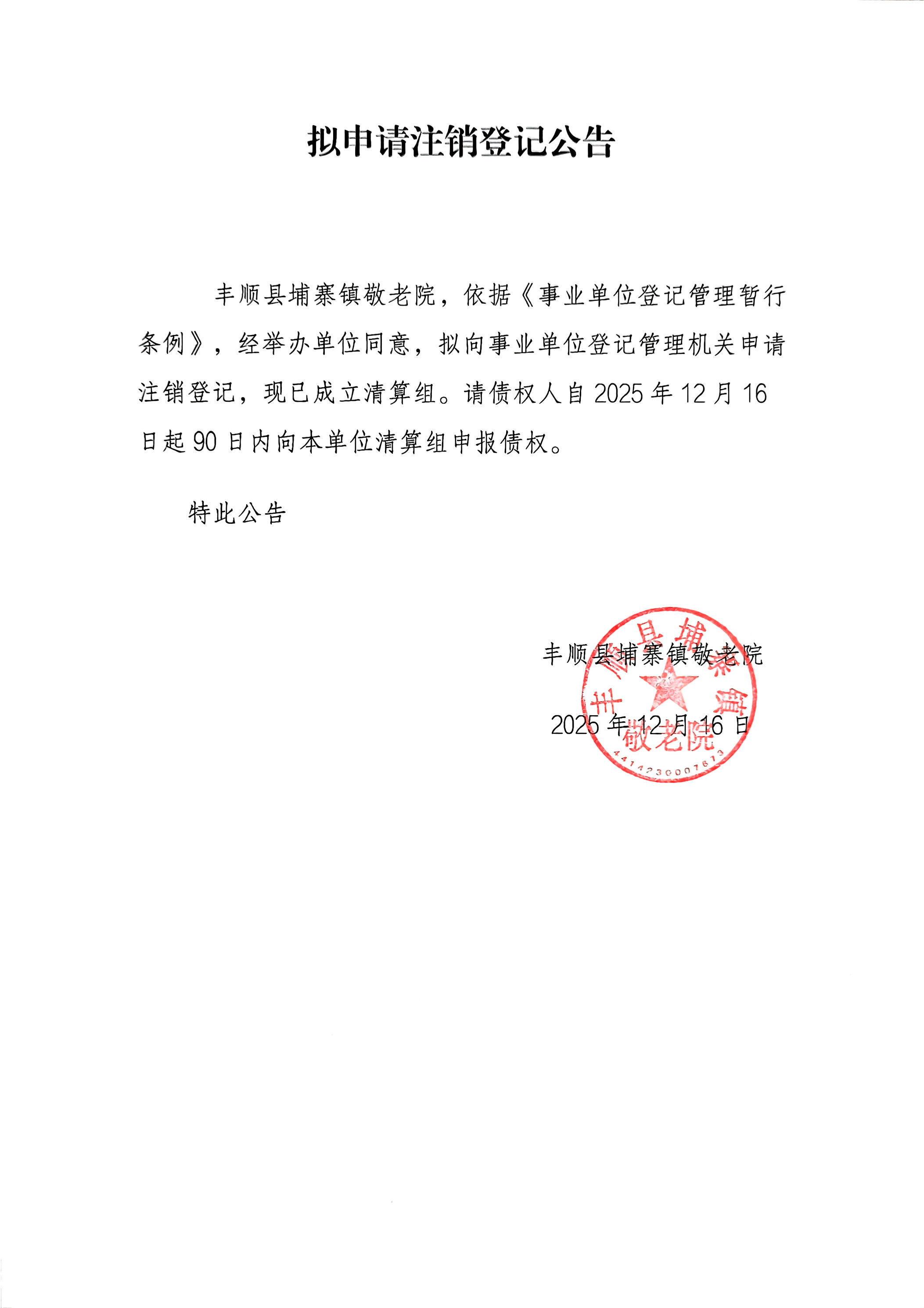 丰顺县埔寨镇敬老院拟申请注销登记公告(第三次公告)