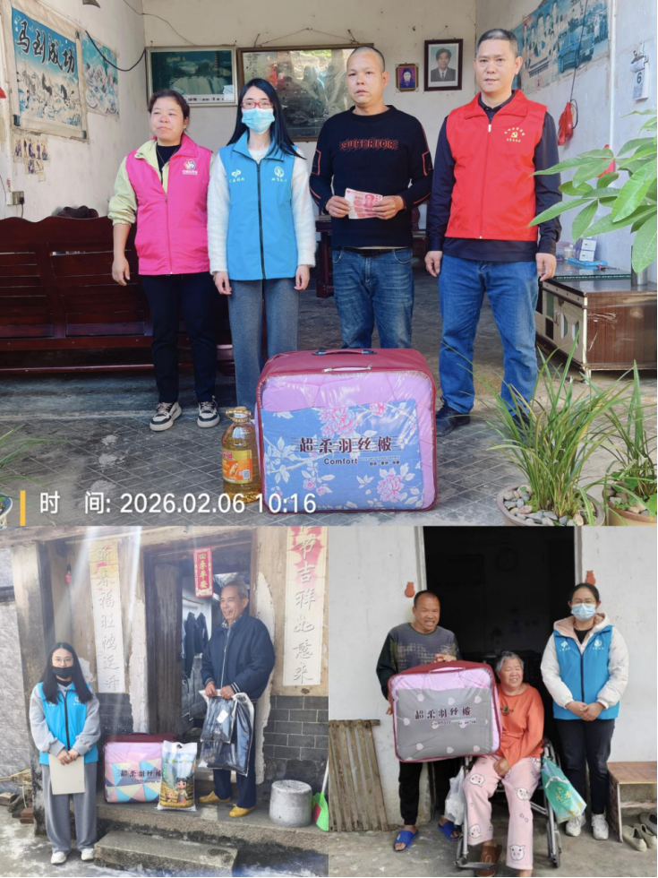 慰问组携带着米、油等生活物资,还有棉服、棉被、棉裤等防寒物品,逐户走访。每到一家,都会和群众热情交谈,仔细询问身体情况、日常生活以及实际困难,认真查看住房保暖、用火用电等状况,同时细心讲解低保救助、医疗帮扶、残疾人两项补贴等惠民政策,把慰问关怀送到群众的心坎里。“天冷被暖,党的政策更暖!”独居老人李伯接过厚实棉被时的感叹,说出了群众的真实心声。对于行动不便的老人,村委干部与社工还暖心地为其铺好新棉被、整理衣物,用细微的举动让慰问更具温度、更有质感。