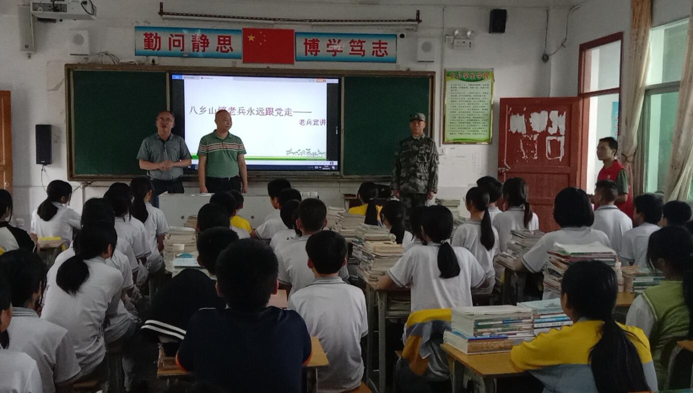 我镇邀请曾参加对越自卫反击战并荣立个人三等功的老兵廖汉标同志,围绕“不忘初心 砥砺奋进”主题,为八乡山学校师生讲述中越边境自卫反击战,一身戎装的廖汉标同志在讲台上,结合自身经历,以“老兵”身份、从“老兵”视角、用“老兵”语言生动讲述了在战斗中如何发挥不怕苦、不怕死的精神,出色完成穿插打援任务的战斗经历。廖汉标还为大家逐一讲述了彭云火、侯满厚、陈代富的光荣事迹和英雄故事,通过英雄故事激励鼓舞同学们,在学生心中种下了崇尚英雄、争做英雄的红色种子。