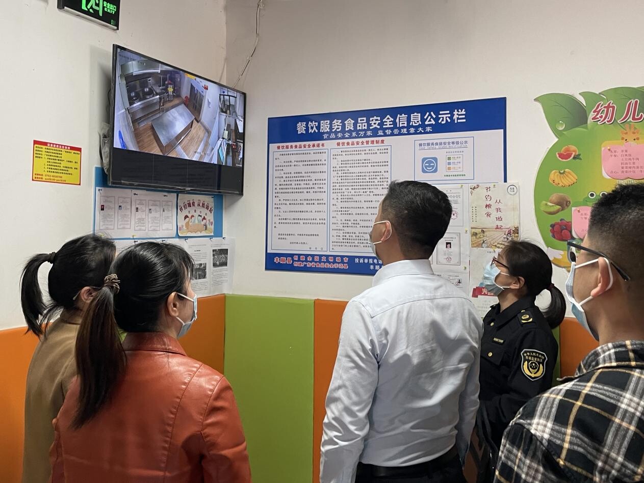 督导组现场查看了餐厅环境,检查了相关设施设备,认真查看了食堂信息公示栏并通过闭路电视细致观看了后厨操作间。市场监督管理局的相关人员向徐晓东介绍,通过监控,市场监督管理局人员也可以实时观看厨房的动态以及后厨的操作。徐晓东在检查过程中听取了校园食品安全的相关汇报,详细了解了食品安全管理制度建设、从业人员健康管理、原料采购、进货查验、食材处理与“互联网+明厨亮灶”管理、陪餐制等工作情况,对我园食堂卫生和食品安全管理的细致严谨给予了肯定。