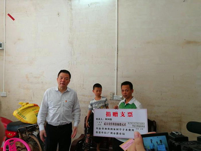 在中心村,樊群一行入户慰问了简国稳和刘意团等两户贫困户。在了解简国稳的小儿子简润泉(其于去年因交通意外跌倒造成右脚骨折,并于9月在广州市教育评估中心资助下到广州检查和手术,现在家进行康复锻炼)的病情和康复情况后,樊群送上了“630捐款”慰问金21960元,并嘱咐简润泉在养病期间要好好复习功课,不能把学习落下;在得知刘意团的两个孩子今年高考分数都超过本科线后,樊群非常欣慰,勉励其要努力读书,将来通过知识和能力改变家乡面貌,他还安慰刘意团不要担心学费问题,当地党委和政府以及广州市教育局会有相关助学政策,帮助孩子们完成学业。