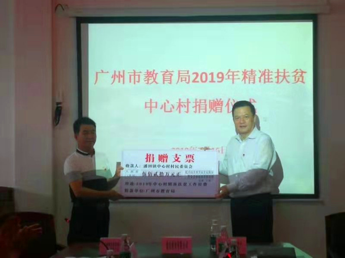 樊群一行在中心村还举行了捐赠仪式和发放助学金等活动。樊群代表广州市教育局向中心村捐赠2019年精准扶贫工作经费520万元;爱心企业广东狮子会爱挥杆高尔夫服务队向10名贫困户学生捐赠助学金合计2万元。