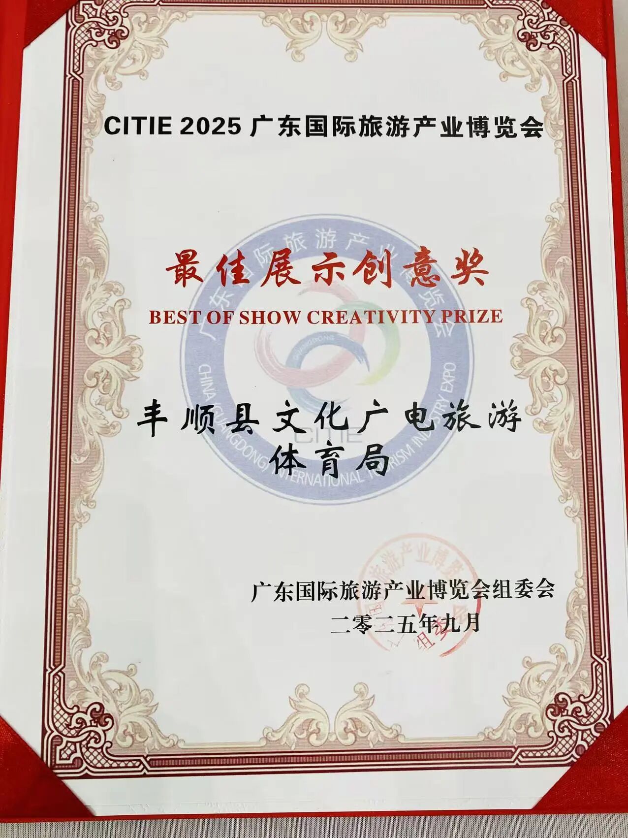 丰顺县文化广电旅游体育局荣获2025广东国际旅游产业旅博会“最佳展示创意奖”荣誉称号。