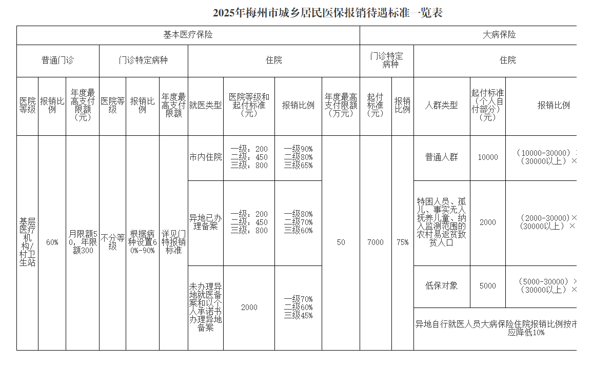 2025年度梅州市职工医保、城乡居民医保报销待遇标准一览表