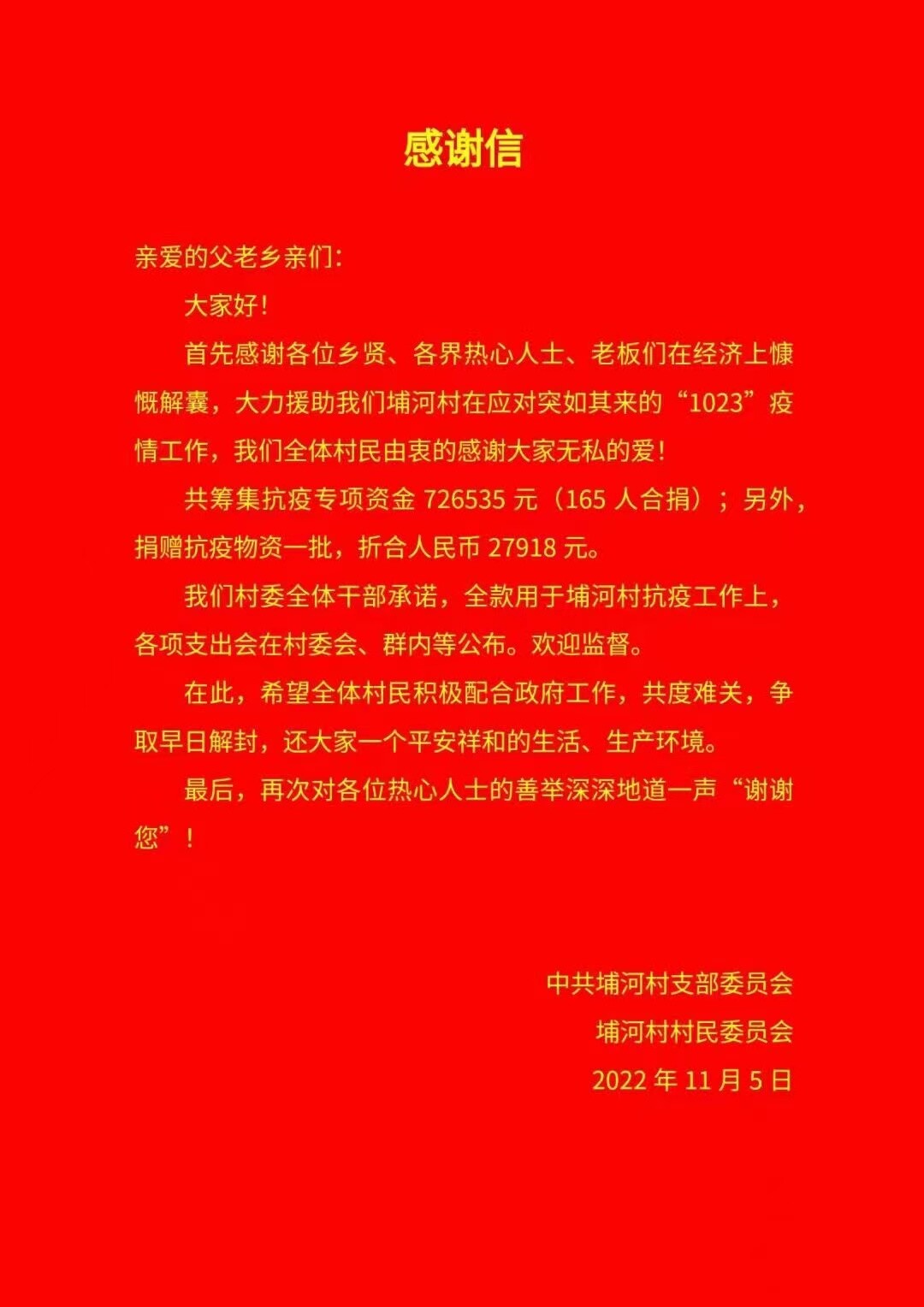 为表彰感谢众多乡贤乡亲乐善好施之善举,凝聚起支援家乡埔河抗击疫情的强大力量,特此表示衷心感谢!