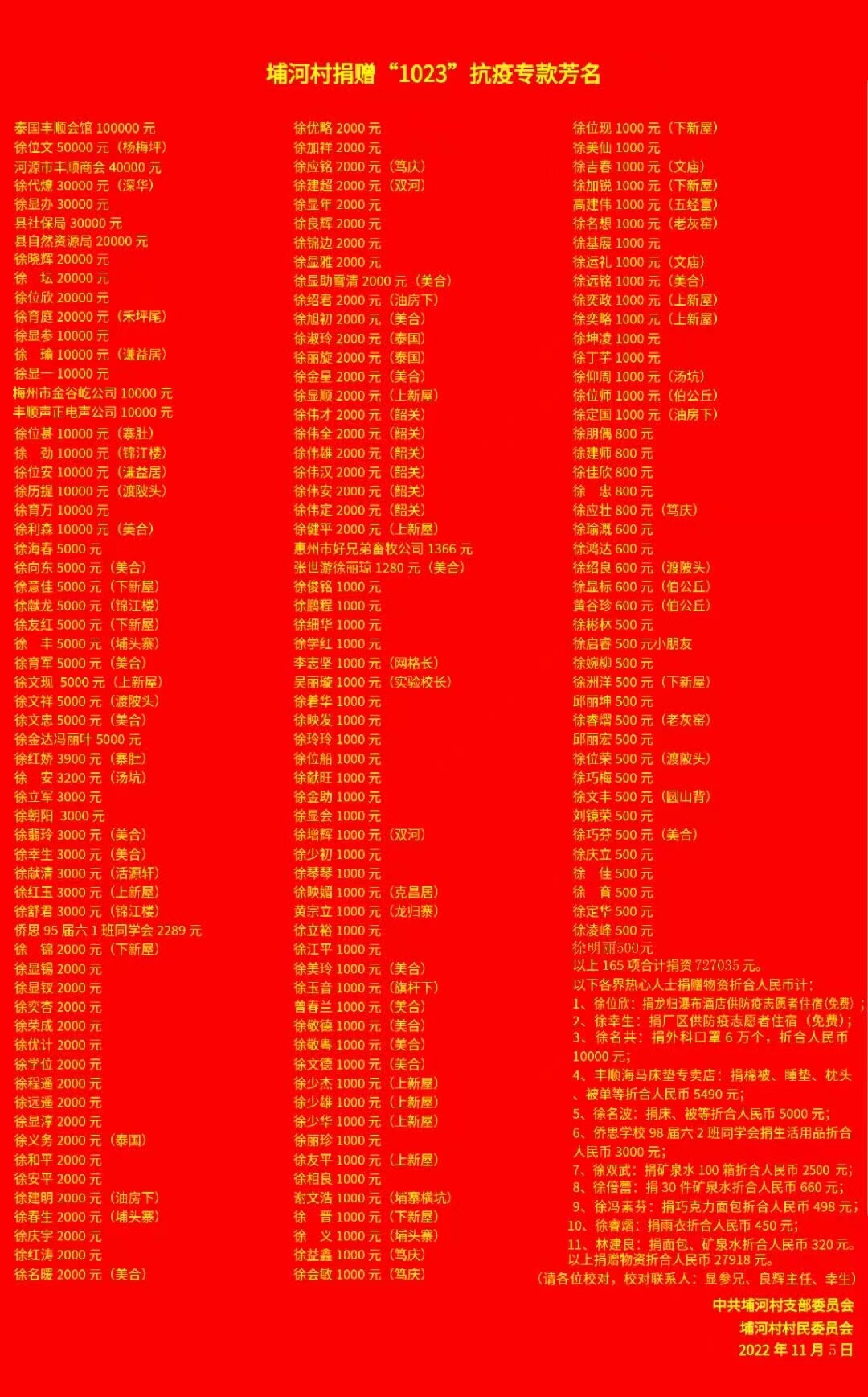 据了解,疫情发生后,以埔河村支部书记徐显年为代表,同该村村“两委”班子下沉到抗疫一线,提议向乡亲、外出乡贤和海外侨亲发出倡议书,呼吁大家捐款捐物,支援抗疫,此举得到了大家的一致同意。倡议书发出后,埔河村乡亲、外出乡贤、旅泰侨亲纷纷捐款捐物共克时艰。短短2天时间,埔河村共收到167笔善款合计737035元和一批抗疫物资(折合人民币27918元)。(名单详见附表)
