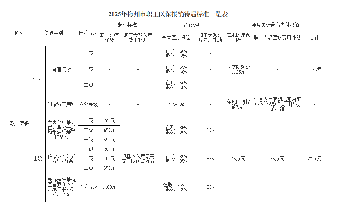 2025年度梅州市职工医保、城乡居民医保报销待遇标准一览表
