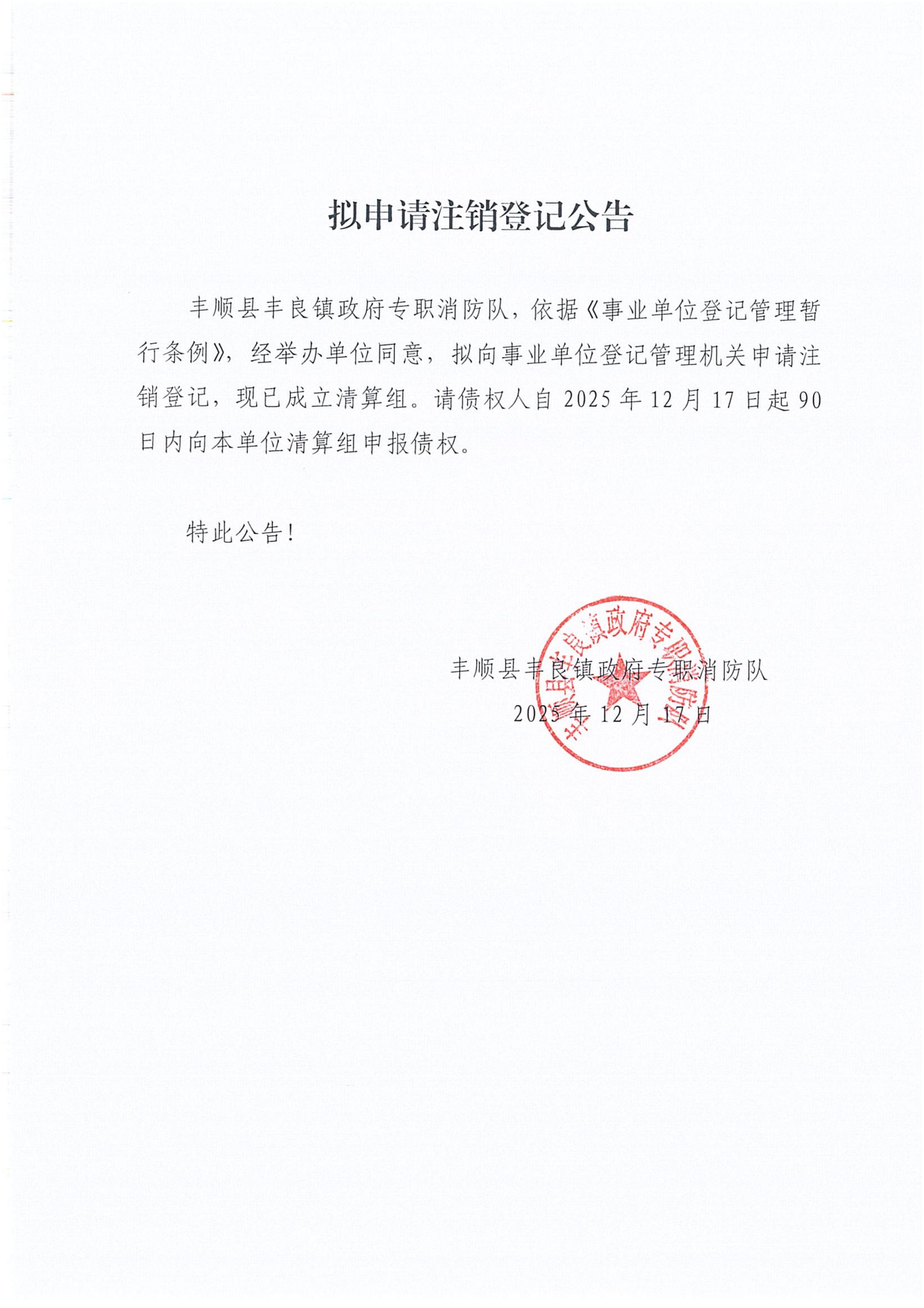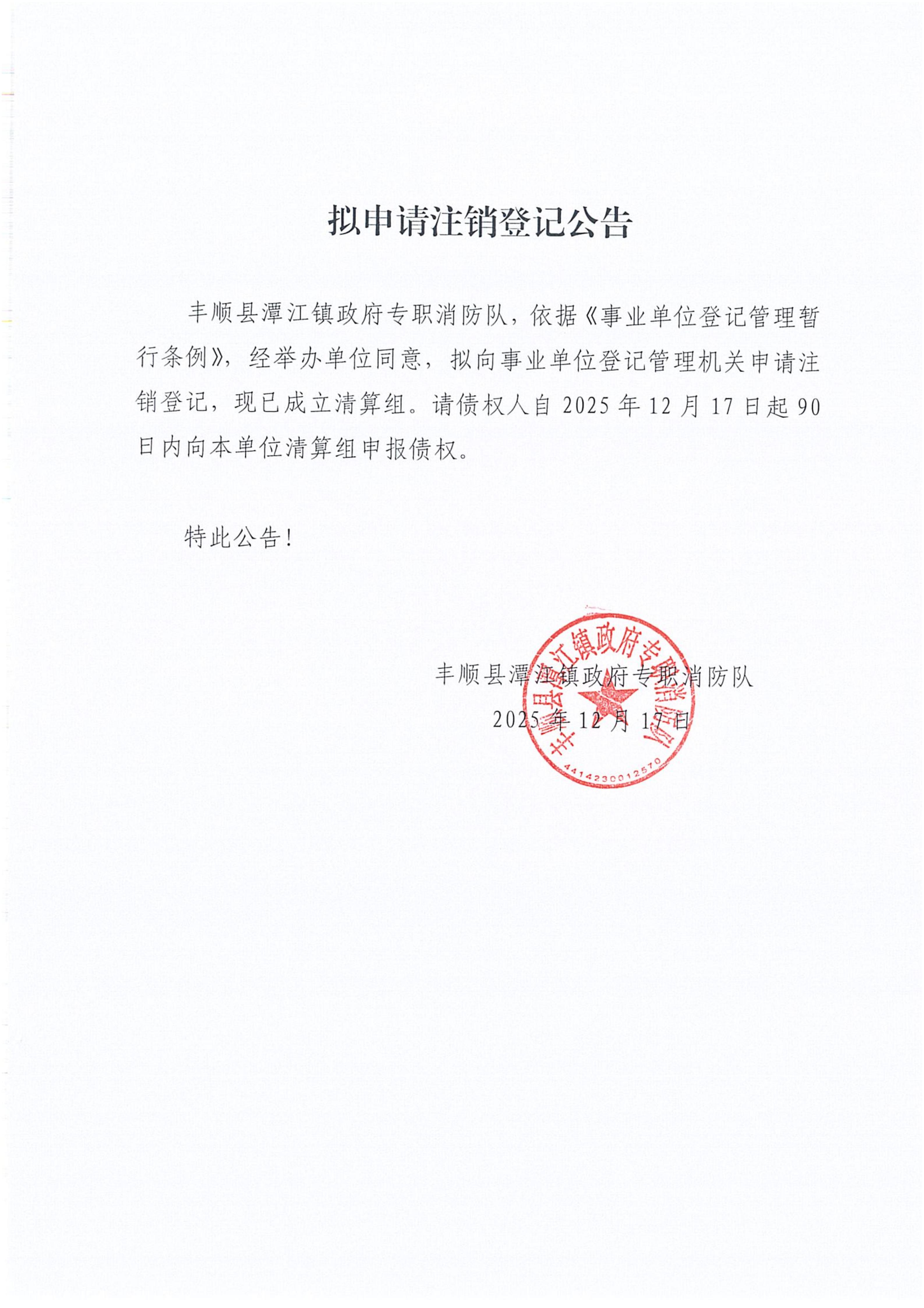 丰顺县丰良镇政府专职消防队、丰顺县留隍镇政府专职消防队、丰顺县潭江镇政府专职消防队拟申请注销登记公告(第三次公告)