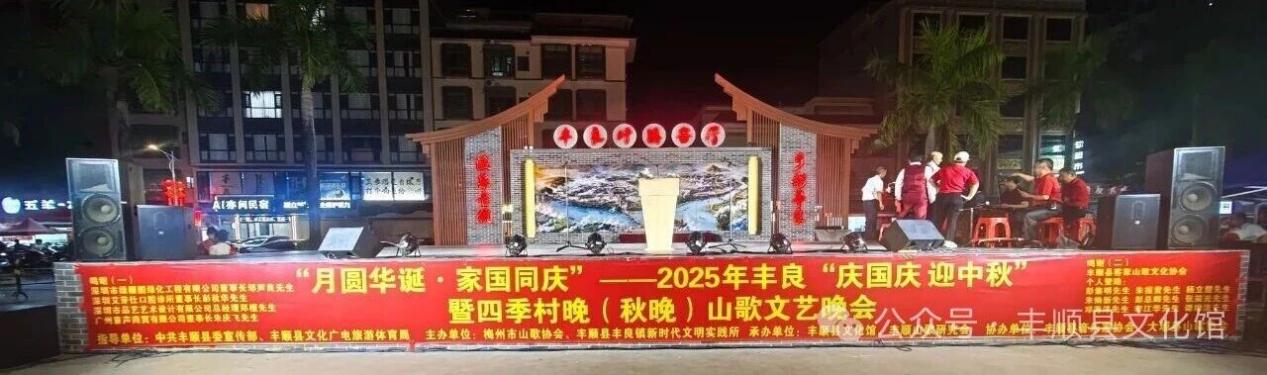 月满中秋,家国同庆。10月3日,丰良镇文化广场灯火璀璨、人声鼎沸。由中共丰顺县委宣传部、丰顺县文化广电旅游体育局指导;梅州市山歌协会、丰顺县丰良镇新时代文明实践所主办;丰顺县文化馆、丰顺县山歌研究会承办;丰顺县音乐家协会、大埔山歌协会协办山歌文艺晚会在此圆满举办。